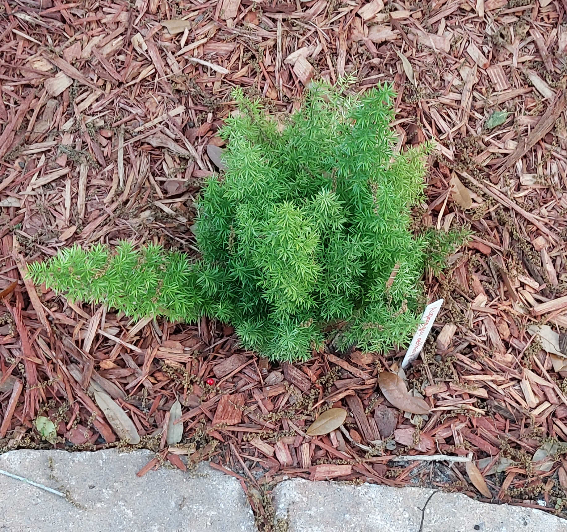 The foxtail fern in the bottom-left corner of the garden, when looking from the front. It’s right by the sidewalk.